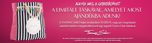 Válaszd kis és rendeld meg a legújabb kedvenceiddé váló Thomas Sabo ékszert vagy órát, legalább 39 000 Ft értékben és megajándékozunk egy eredeti, Thomas Sabo Charm Club táskával!