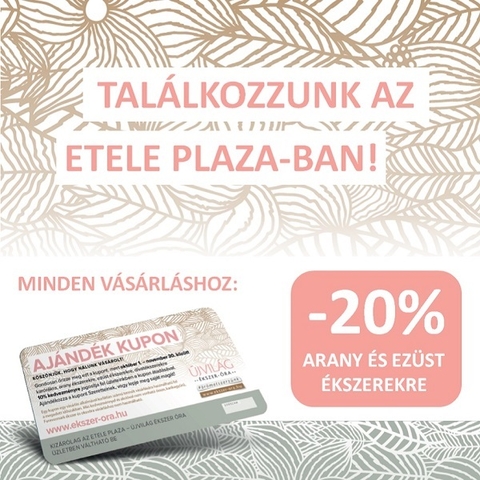 ** Szeptember 17-30. között, bármely értékű vásárlás esetén. A kupon október 1. és november 30. között váltható be kizárólag az Etele Plaza-ban lévő Újvilág Ékszer Óra üzletünkben. Egy kupon egy vásárlás alkalmával korlátlan számú termék vásárlására használható fel. Más kedvezménnyel és akcióval nem vonható össze, karikagyűrű, Forevermark ékszer és okosóra vásárláshoz nem használható.