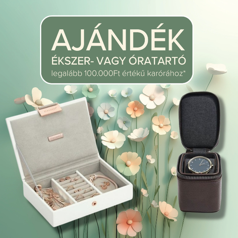 *Webshopunkban a teljes árú, legalább 100.000Ft értékű női vagy férfi karóra vásárlása esetén választható az ajándék a készlet erejéig, ill. visszavonásig. Más kedvezménnyel, akcióval, ajándékkal, online kuponkóddal nem vonható össze. Okosórákra nem vonatkozik. Kérjük, hogy az ajándék terméket ne helyezze a kosarába, mivel azt a rendszer vásárlásként fogja kezelni. A termékképeken látható ékszerek és óra csak illusztrációként szolgálnak, nem képezik az ajánlat részét.
