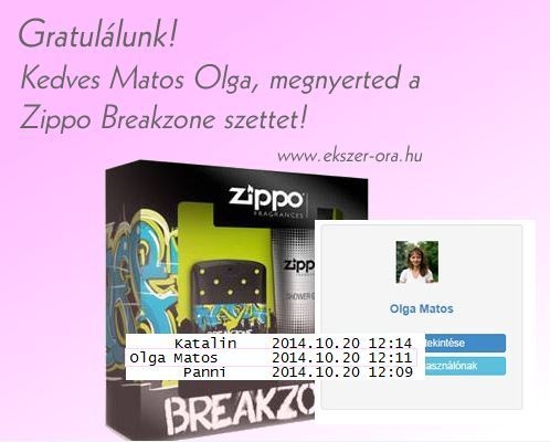 Gratulálunk nyertesünknek: Matos Olgának! Hamarosan postára adjuk kedvenc parfümjét, a ZIPPO Breakzone szettet!