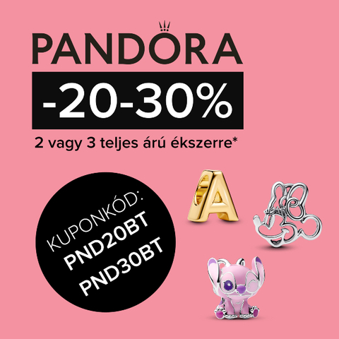 - 3db (vagy több) teljes árú Pandora ékszer vásárlása esetén pedig 30% kedvezményt biztosítunk a PND30BT kuponkóddal!