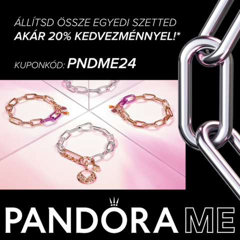 *Az ajánlat 2024. december 31-ig, ill. a készlet erejéig érvényes webshopunkban. Az ajánlatban 1db Pandora ME karkötő, nyaklánc vagy fülbevaló (hordozó), valamint 2db Pandora ME stíluselem együttes vásárlása esetén jár 20% kedvezmény a szettre. Más ajánlattal, kedvezménnyel, ajándékkal, egyéb kuponkóddal nem vonható össze.
