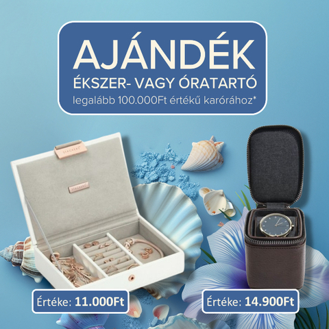 *Webshopunkban a teljes árú, legalább 100.000Ft értékű női vagy férfi karóra vásárlása esetén választható az ajándék a készlet erejéig, ill. visszavonásig. Más kedvezménnyel, akcióval, ajándékkal, online kuponkóddal nem vonható össze. Okosórákra nem vonatkozik. Kérjük, hogy az ajándék terméket ne helyezze a kosarába, mivel azt a rendszer vásárlásként fogja kezelni. A termékképeken látható ékszerek és óra csak illusztrációként szolgálnak, nem képezik az ajánlat részét.