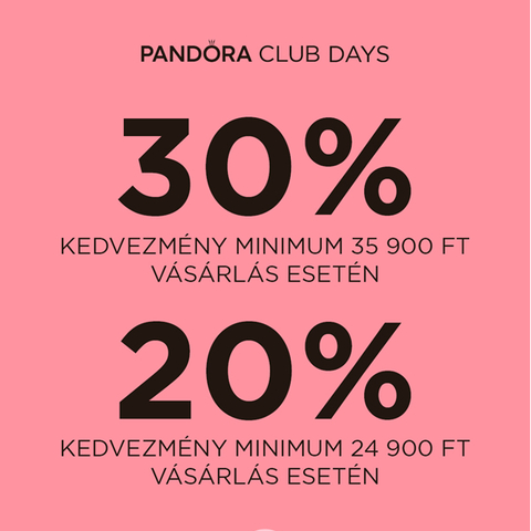 - legalább 35.900 Ft értékű, teljes árú Pandora ékszer(ek) vásárlása esetén pedig 30% kedvezményt biztosítunk a PND3004 kuponkóddal!