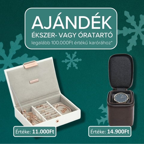 *Webshopunkban a teljes árú, legalább 100.000Ft értékű női vagy férfi karóra vásárlása esetén választható az ajándék a készlet erejéig, ill. visszavonásig. Más kedvezménnyel, akcióval, ajándékkal, online kuponkóddal nem vonható össze. Okosórákra nem vonatkozik. Kérjük, hogy az ajándék terméket ne helyezze a kosarába, mivel azt a rendszer vásárlásként fogja kezelni. A termékképeken látható ékszerek és óra csak illusztrációként szolgálnak, nem képezik az ajánlat részét.