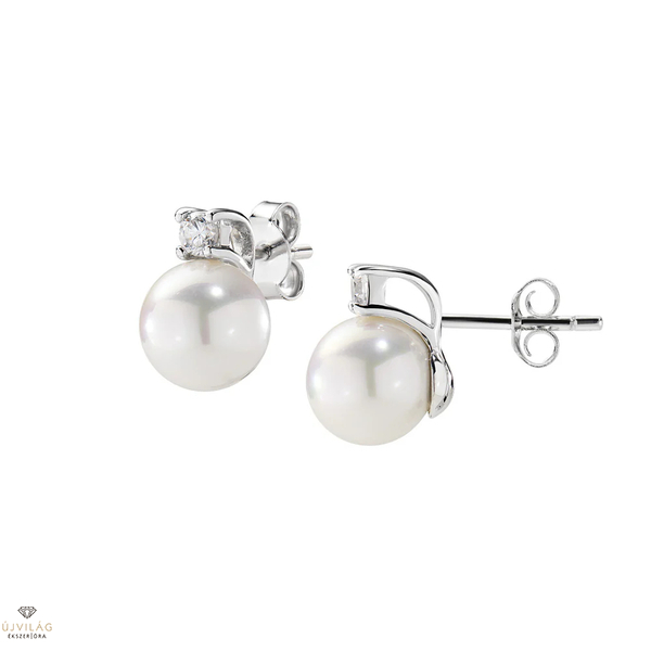 Rhodium-bevonatú sterling ezüstből készült fülbevalók fehér cirkóniával és kagylógyönggyel. Pillangócsatlakozással. A fülbevaló teljes mérete 1 cm, míg a gyöngy mérete 8 mm. A gyöngyök és a cirkónia kombinációjával ezek a fülbevalók elengedhetetlen klasszikus darabok.
