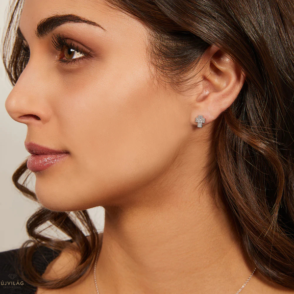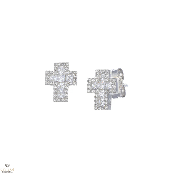 Rhodiumbevonatú sterling ezüstből készült kereszt fülbevalók, középen négyzet alakú fehér cirkóniával és fehér cirkóniával szegélyezve. Méretek: 8 x 6 mm. Pillangókapcsos rögzítés.
