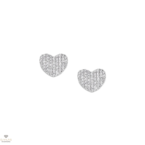 Rhodium-bevonatú sterling ezüst fülbevalók fehér cirkóniával. Lapos szív alakúak. Méretek: 9 x 9 mm. Pillangócsatlakozással.
