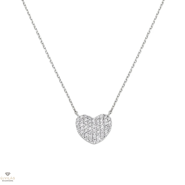 Rhodium-bevonatú sterling ezüst nyaklánc fehér cirkóniás lapos szív medállal. A medál mérete: 1 x 1,2 cm. Állítható lánchossz 40-45 cm között, hosszabbító láncszemekkel és karabineres zárral.