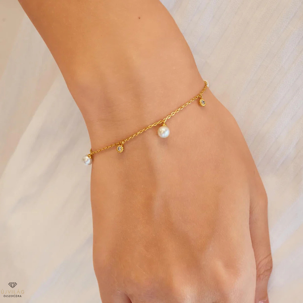 Azoknak a nőknek, akik könnyed eleganciát és játékos bájt sugároznak. Ez a karkötő fényes kagylógyöngyökkel és ragyogó cirkóniakövekkel díszített, amelyek a lánc finom elemeihez vannak rögzítve. Finom láncokkal könnyedén kombinálható, igazán elbűvölő megjelenést kölcsönöz. Tökéletes választás partikra és különleges alkalmakra, ezek a darabok pontosan a megfelelő mennyiségű csillogást adják a legemlékezetesebb pillanatokhoz – akár ünnepi öltözékhez, akár egy különleges személynek szánt ajándékhoz.