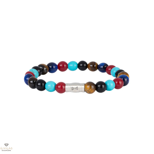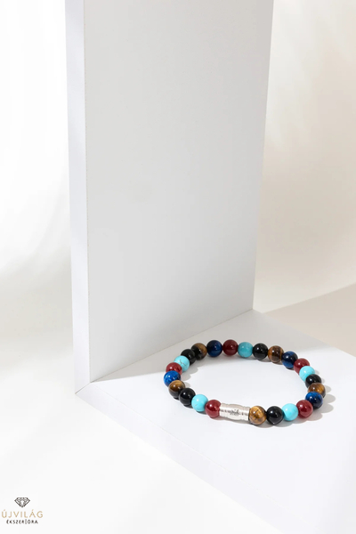Ez a karkötő 5 kiváló minőségű drágakőből készült, amely tökéletesen kombinálható mind a hivatalos, mind az alkalmi ruházattal. 8 mm-es gyöngyökkel és finom 925-ös ezüst zárral készült. Az erős rugalmas zsinór tartja össze ezt a karkötőt, és kényelmes illeszkedést biztosít. 5 különböző 8mm-es gyöngyből készült. Barna tigrisszem, fekete achát, türkiz, vörös jáde és kék tigrisszem. Finom 925-ös ezüst zárral zárva. Kombináld ezt a karkötőt más Aze ékszerekkel, és adj a megjelenésednek egy stílusos pluszt. Méretek: M (17.5cm)