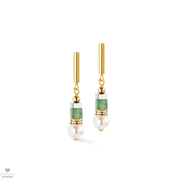 Könnyű, ragyogó és természetes mélységű – a Precious Fusion Offset arany-zöld fülbevalók ötvözik a zöld aventurin nyugtató szépségét és a Swarovski® fehér kristálygyöngyök lágy csillogását. Az arany színű rozsdamentes acél díszítések elegáns kiemeléseket hoznak létre. Elengedhetetlen kiegészítő mindenki számára, aki szereti a különleges dolgokat. Hossz: 3,3 cm; Szélesség: 6 mm.