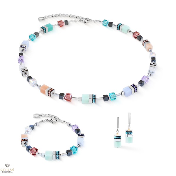 A GeoCUBE® Precious Motion karkötő „Sorbet silver” változat finom és kifejező kompozíciójában tükrözi a kollekció jellegzetes formanyelvét. Az amazonit, a kalcedon és a rózsaszín aventurin a hematittal és a Swarovski® kristályokkal párosulva harmonikus szín- és szerkezeti játékot teremt. A sorbet árnyalatok könnyed, mégis kifinomult hangulatot kölcsönöznek az ékszernek.