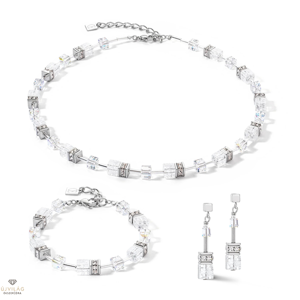 GeoCUBE® Iconic Nature ezüst-fehér karkötő: a klasszikus szépség. A GeoCUBE® Iconic Nature karkötő ezüst-fehér színben klasszikus eleganciát kölcsönöz a csuklójának. Az ezüstszínű rozsdamentes acél, az átlátszó kristályok és a repedezett hegyikristály kockák kombinációjával ez a karkötő időtálló kiegészítő, amely bármilyen öltözékhez illik. Akár mindennapi viselethez, akár különleges alkalmakra, ez a karkötő finom, mégis feltűnő kifinomultságot kölcsönöz a stílusának, miközben igazán trendi marad. Méretek: Hossza 18,5 cm + hosszabbítás 3 cm