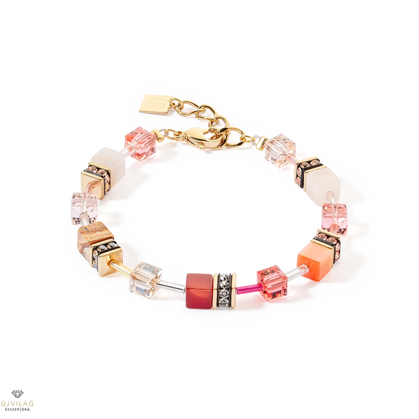 A GEOCUBE® Iconic Precious karkötő piros és bézs színben egy gyönyörű ékszer a meleg színek és a természetes elemek lenyűgöző kombinációjával. Megtestesíti a GEOCUBE® kollekció jellegzetes stílusát, és a karneol, a rózsaszín aventurin és a bézs színű jáspis természetes szépségét aranyszínű részletekkel kombinálja. Hossz: 18,5 cm + 3 cm hosszabbító lánc.