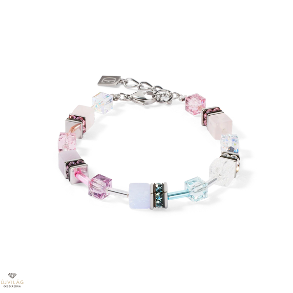 Finom, nőies, modern - a GeoCUBE® Iconic Precious karkötő rózsaszín-lila a kalcedon, a hegyikristály és a rózsakvarc lágy árnyalatait ötvözi a Swarovski® kristálykockák csillogó tükröződésével. A hűvös, ezüstszínű rozsdamentes acél modern kontrasztot alkot, míg a harmonikus színpaletta könnyed, elegáns kisugárzást kölcsönöz. Hossz: 18,5 cm + 3 cm hosszabbító lánc