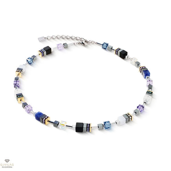 A fény és az árnyék játéka: A Precious Motion nyaklánc Blue Moon Bicolour a GeoCUBE® markáns formáját modern, dinamikus vonalakkal kombinálja. Az olyan drágakövek, mint a szodalit, az ónix, a kalcedon és a hegyikristály hűvös eleganciát tükröznek mélykék és ragyogó fehér színekben. A hematit elemek - részben titán-oxiddal finomítva - finom arany- és ezüsthatásokkal találkoznak, és teszik ezt a dizájnt kifinomult, világos formanyelvű kiemelkedővé.