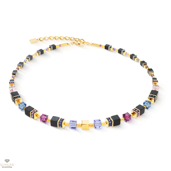 Klasszikus design és erőteljes színvilág találkozik: A 6 mm-es GeoCUBE® kockák éjkék, lila, rózsaszín és jégkék színben, mélyfekete ónixszal és csillogó kristályokkal kombinálva alkotnak feltűnő összképet. Az aranyozott hematitból készült finom, kocka alakú elemek elegáns hangsúlyokat képeznek a kövek között. Hátul finoman kúposodik az optimális viselési kényelem érdekében - egy kifinomult ékszer.