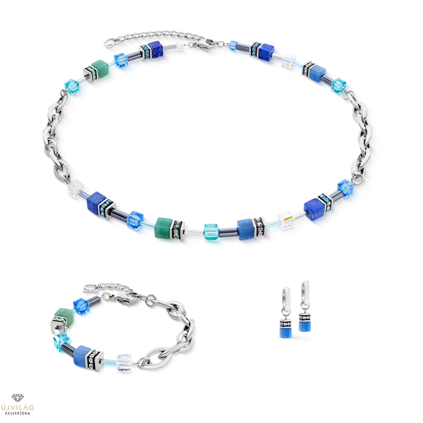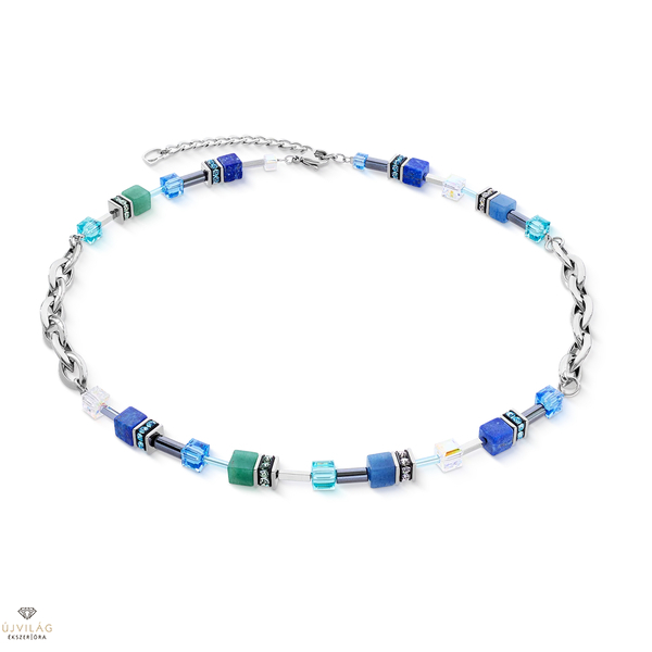 A lapis lazuli és az aventurin kockáit hematit elemek, csillogó Swarovski® kristályok és ragyogó strassz rondellák emelik ki. A rozsdamentes acélból készült vastag lánc városi erőt és magabiztos kontrasztot kölcsönöz a geometrikus kockasorozatnak.