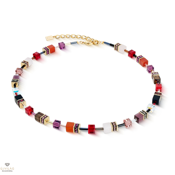 Élénk színek, erős kövek - ez a nyaklánc az érzékek ünnepe: az élénkvörös karneol, a mélyfekete ónix, a finom rózsakvarc és a meleg füstös kvarc az ikonikus GeoCUBE® kockákban egy energiával teli kompozíciót alkot. A Swarovski® kristályok és csillogó kristályok szikrázó fénypontokat teremtenek, míg az aranyszínű rozsdamentes acél elegáns csillogást kölcsönöz. A Németországban gondosan kézzel készített ékszer egyesíti a modern eleganciát a valódi drágakövek természetes ragyogásával - tökéletes arra, hogy bármilyen öltözéket kifejező megjelenéssé varázsoljon.