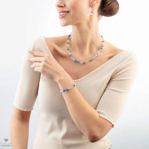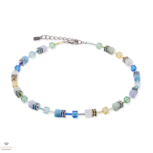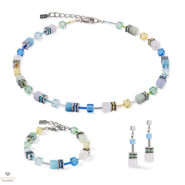 Olyan frissítő, mint a tenger - a GeoCUBE® Iconic Precious nyaklánc aquazöld színben olyan hűvös drágaköveket kombinál, mint a kalcedon, a hegyikristály és az amazonit, csillogó Swarovski® kristálykockákkal. Az ezüst rozsdamentes acél elemek tisztaságot kölcsönöznek a dizájnnak, és modern klasszikussá teszik a nyakláncot. Méretek: Hossz: 42 cm + 6 cm hosszabbító lánc. Átmérő: 0,6 cm.