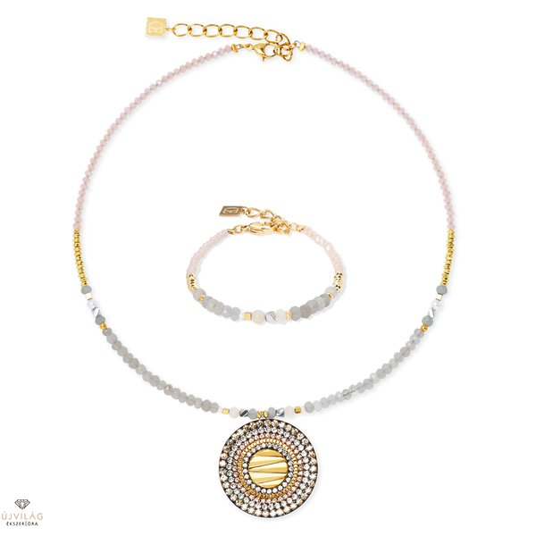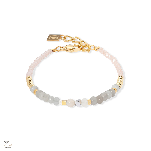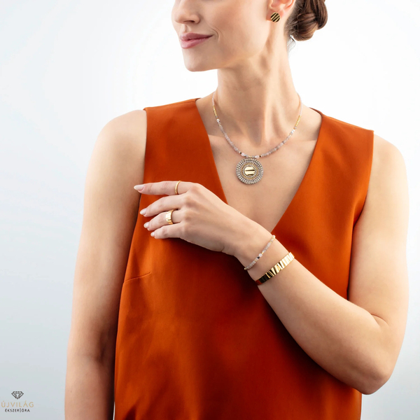 Modern, áramló, más - a Modern Future arany-bézs karkötő az achát földes mélységét ötvözi a lágy jáde árnyalatokkal és egy csipetnyi csillogással. A fazettált üveg megragadja a fényt és könnyedséget kölcsönöz a dizájnnak. Tökéletes mindenkinek, aki szeretné újraértelmezni az aranyat. Méretek: 17,5 cm + 3 cm hosszabbító lánc.