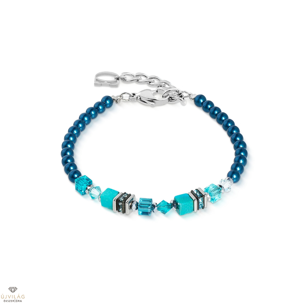 A Princess Teal Glow ezüst karkötő visszatükrözi a nyaklánc jellegzetes kialakítását: a Swarovski® türkizkék Crystal Pearls gyöngyei, a csiszolt Swarovski® kristályok, a türkizkék kocka alakú drágakövek és a csillogó strassz rondellák harmonikus egészet alkotnak.