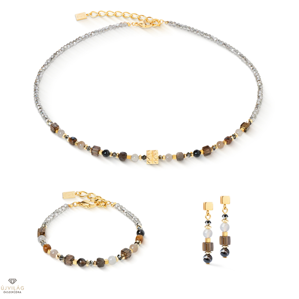 A Shape Mix Spikes Smoky Glow karkötő a tigrisszem, a füstös kvarc, a csokoládé holdkő, az achát és a csíkos ónix elegáns színeit ötvözi a Swarovski® kristályok csillogó tükröződésével. Az aranyozott rozsdamentes acél modern hangsúlyokat állít és elegáns befejezést biztosít. A meleg barna árnyalatok harmonikus összjátéka teszi ezt a karkötőt sokoldalú kiegészítővé, amely bármilyen megjelenést feldob - az elegánstól az alkalmiig.