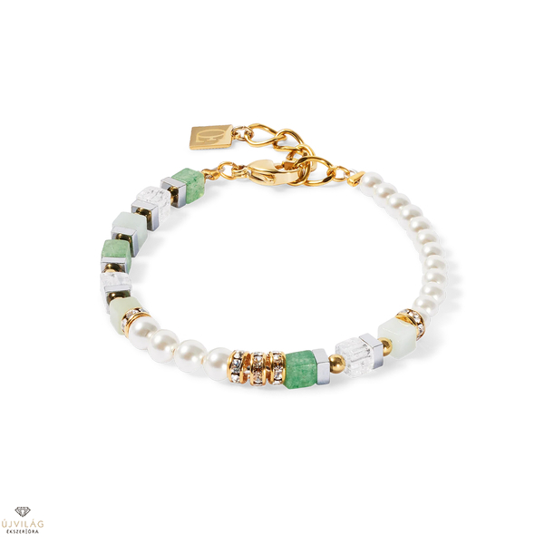 Természetesen szép, játékosan elegáns - a Precious Fusion Offset karkötő arany-zöld kombinálja az amazonit, a zöld aventurin és a hegyikristály élénk zöld tónusait a Swarovski® lágyan csillogó fehér kristálygyöngyeivel. Az aranyszínű rozsdamentes acélból készült aranyszínű részletek kifinomult jelleget kölcsönöznek a karkötőnek, míg a kifinomult offset kialakítás modern, könnyed megjelenést eredményez. Tökéletes társ a stílusos megjelenéshez egy kis természetességgel. Méretek: Hossz: 18 cm + 3 cm hosszabbító lánc. Átmérő: 0,4 cm.