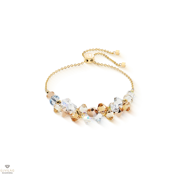 Dancing Crystals karkötő arany-bézs - csillogó elegancia a csuklón A Dancing Crystals karkötő arany-bézs színben ötvözi a finom könnyedséget a csillogó ragyogással. A Swarovski® kristályok csillogó bézs árnyalatú és tiszta árnyalatokban világító fénypontokat hoznak létre, amelyek minden mozdulatnál táncolni látszanak. A finom aranyszínű rozsdamentes acéllánc elegáns kontrasztot alkot, és a karkötő viselése könnyű és légies érzést kelt. A tolózárnak köszönhetően a karkötő egyénileg állítható, és minden csuklóra tökéletesen illeszkedik. Női szemet gyönyörködtető, amely feldobja a mindennapi megjelenést, és csillogó kifinomultsággal teszi teljessé az ünnepi öltözéket.