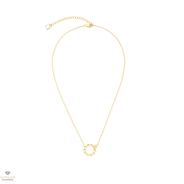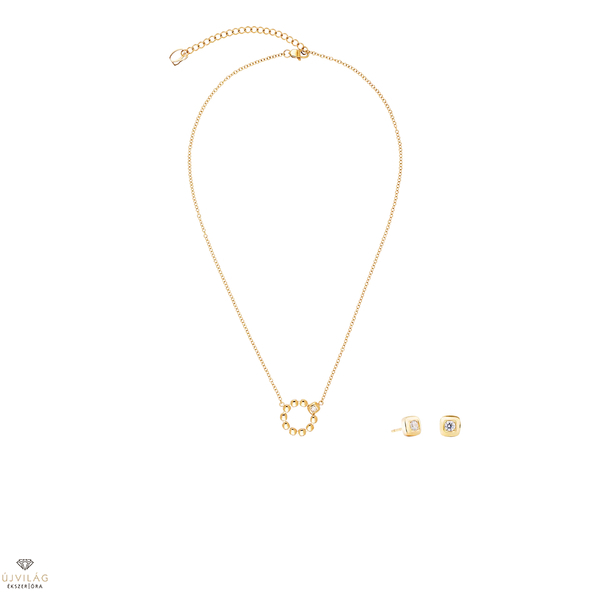Finom aszimmetrikus hatást kelt a nagyobb, cirkóniával díszített kockához rögzített oldalsó függeszték. Ez a kifinomult részlet modern feszültséget kölcsönöz és elegáns fényvisszaverődéseket ad. A finom arany színű lánc fokozza a légies kifinomultságot, így ez a darab időtálló alapdarabja a mindennapi viseletnek.