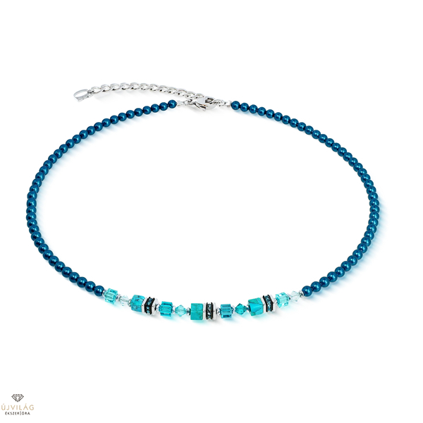 A színek és textúrák kifejező játéka: a Princess Teal Glow ezüst nyaklánc a Swarovski® intenzív csillogású, türkizkék Crystal Pearls gyöngyeit ötvözi csiszolt Swarovski® kristályokkal és türkizkék drágakő kockákkal. A strassz körök ragyogó akcentusokat teremtenek az elemek között, és ritmikus feszültséget kölcsönöznek a kialakításnak.