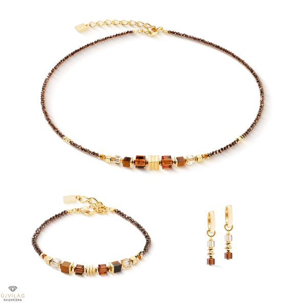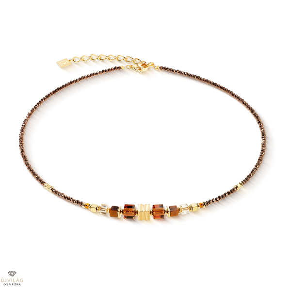Ennek az elegáns kompozíciónak a középpontjában a jellegzetes hullámkocka áll, amelyet meleg borostyánszínű, valódi tigrisszemű és titán-oxidos fényes hematit fazettált kristályok kereteznek. Az aranybarna színharmónia és az arany rozsdamentes acélból készült filigrán elemek időtlen eleganciát kölcsönöznek a nyakláncnak. Ez a Németországban kézzel készített ékszer a precíz formatervezést kiváló minőségű anyagokkal ötvözi, és ideális kiegészítője a stílustudatos megjelenésnek.