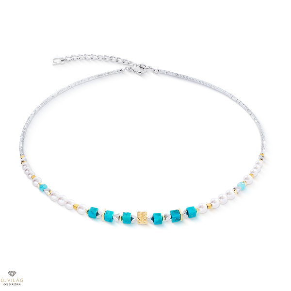 A Modern Elegance Spikes arany-türkiz nyaklánc a kortárs letisztultságot ötvözi az élénk színek intenzitásával. Középpontjában az arany színű rozsdamentes acélból készült, jellegzetes tüskés kocka áll, amely erőteljes geometriai jelenlétet kölcsönöz a kialakításnak. Ezt ragyogó türkiz, lágy amazonit, csillogó Swarovski® Crystal Pearls gyöngyök, valamint titán-oxid bevonattal ellátott hematit keretezi, ami további mélységet és kontrasztot kölcsönöz a nyakláncnak.