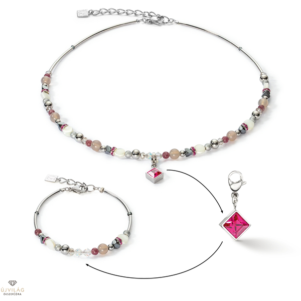 Ez a nyaklánc különböző gyöngyök elegáns kombinációját tartalmazza, mint például achát, gyöngyház, hematit és csillogó kristályok. Nem ez az egyetlen, amitől különleges azonban: van egy levehető, élénk rózsaszínű medál is. Így tökéletes minden alkalomra, az irodában töltött naptól az esti kirándulásig. HOSSZ: 42,5 cm + 6 cm hosszabbító lánc ERŐ: 0,6 cm ÁTMÉRŐ: 0,8 cm