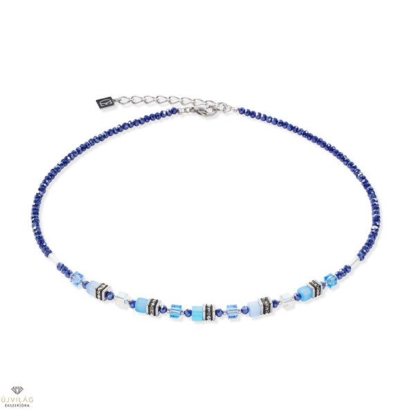 Hűvös, tiszta és abszolút modern - a Mini Cubes kék nyaklánc mélykék Mini GeoCUBE® elemeket kombinál csillogó Swarovski® kristályokkal és filigrán ezüst rozsdamentes acél elemekkel. A minimalizmus és a színek tökéletes egyensúlya, ideális a laza, stílusos megjelenéshez. Hossz: 42 cm + 6 cm hosszabbító lánc.
