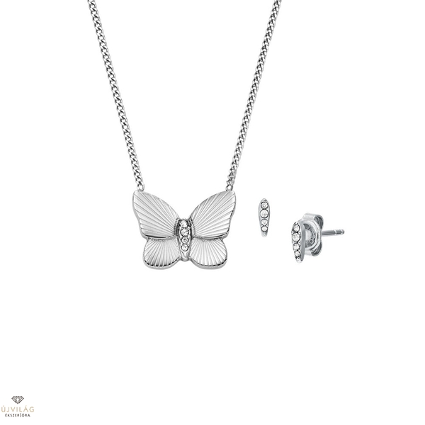 Emeld ki mindennapi megjelenésedet ezzel a kifinomult ékszerkészlettel. Az ezüstszínű rozsdamentes acél nyaklánc finom láncon texturált, pavé díszítésű pillangóval díszített. Párosítsd a letisztult, csillogó fülbevalókkal, amelyek szintén ezüstszínű rozsdamentes acélból készültek. Egy sokoldalú duó, amelyet újra és újra elő fogsz venni. Nyaklánc: Hosszúság: 405,4 mm + 50 mm.