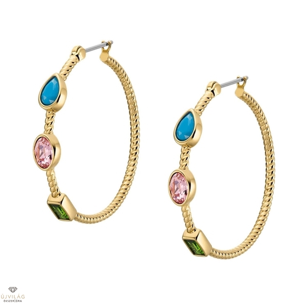 Csiszolt arany színű rozsdamentes acélból készült fülbevalók, amelyek modern sziluettjükön finom kötélszerű textúra látható. A The Good Luck kollekció részét képező merész karikák különböző színű és formájú kristályokkal díszítettek, ami különleges megjelenést kölcsönöz nekik. Méretek: Hosszúság: 35 mm, Szélesség: 2,5 mm.