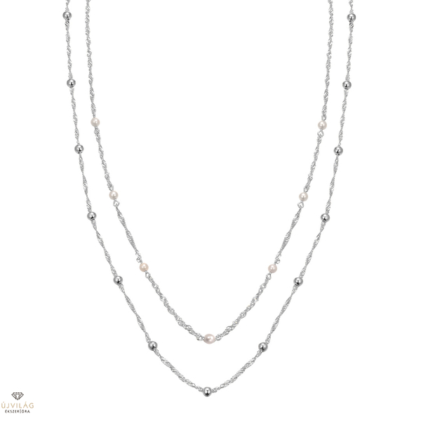 A német családi vállalkozás ezüst ékszerei 925 finomságú ezüstből készülnek, minden követ foglalat tart, ródium bevonat garantálja az ezüst tartós fényét. Kifinomult megjelenés - ez a NANA KAY silver trends. Nőies, csavart láncformájú, duplasoros ezüst nyakék gyönygyökkel. A lánc hosszúsága 48 cm, mely a hosszabbító révén 42 cm-ig rövidebb méretekre is beállítható, szélessége 2 mm. Zárszerkezete karabiner. A kő anyaga édesvízi tenyésztett gyöngy, ezek átmérője kb. 3 mm.