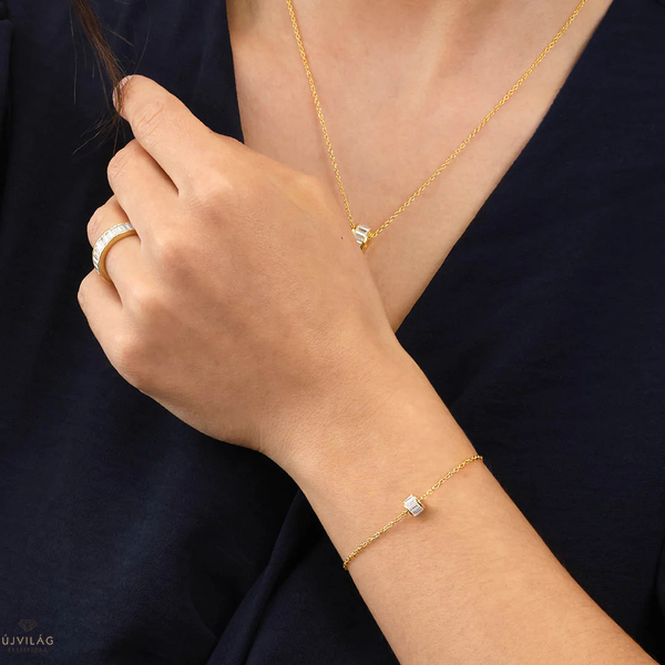 A német családi vállalkozás ezüst ékszerei 925 finomságú ezüstből készülnek, minden követ foglalat tart, ródium bevonat garantálja az ezüst tartós fényét. Kifinomult megjelenés - ez a NANA KAY silver trends. A lánc hosszúsága 19,5 cm, mely a hosszabbító révén kisebb méretre is állítható (16 cm-ig), szélessége 1,5 mm. Zárszerkezete karabiner. A medál henger formájú, átmérője 5 mm, magassága 4 mm. A kő anyaga cirkónia. A sárga arany szín 14 karátos aranybevonat.