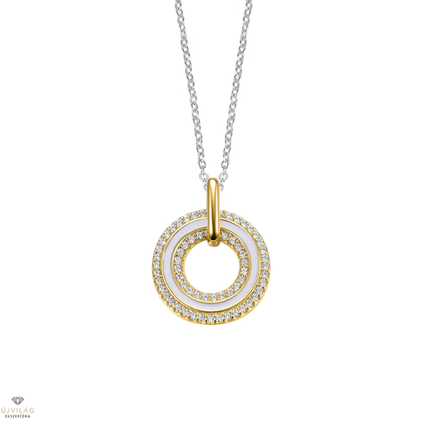 A német családi vállalkozás ezüst ékszerei 925 finomságú ezüstből készülnek, minden követ foglalat tart, ródium bevonat garantálja az ezüst tartós fényét. Kifinomult megjelenés - ez a NANA KAY silver trends. A lánc hosszúsága 48 cm, mely a hosszabbító révén kb. 40 cm-ig rövidebb méretekre is állítható, szélessége 1-2 mm. Zárszerkezete karabiner. A kő anyaga cirkónia. A medál átmérője 18 mm, a körív szélessége 5 mm. A medál sárga színe 14 karátos aranybevonat, a fehér sáv különleges zománc díszítés.
