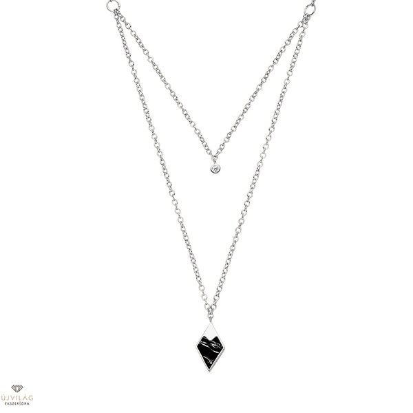 A német családi vállalkozás ezüst ékszerei 925 finomságú ezüstből készülnek, minden követ foglalat tart, ródium bevonat garantálja az ezüst tartós fényét. Kifinomult megjelenés - ez a NANA KAY silver trends. A lánc hosszúsága 48 cm, mely a hosszabbító révén 45 és 42 cm-re is állítható, szélessége 1-2 mm. Zárszerkezete karabiner. A kő anyaga a rövidebb láncrészen cirkónia. A fekete színű medál fenyőkő ásvány. (A medál fekete-fehér mintázatát a kő természetes márványozottsága adja, ezért minden esetben egyedi, a képtől eltérhet!)