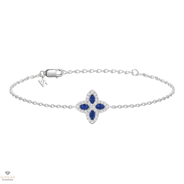 A német családi vállalkozás ezüst ékszerei 925 finomságú ezüstből készülnek, minden követ foglalat tart, ródium bevonat garantálja az ezüst tartós fényét. Kifinomult megjelenés - ez a NANA KAY silver trends. Sötétkék kövekkel díszített virág medálos karkötő. A lánc hosszúsága 19,5 cm, mely a hosszabbító révén 16 cm-ig rövidebb méretekre is beállítható, szélessége 2 mm. Zárszerkezete karabiner. A kő anyaga cirkónia. A virág mérete 12x12 mm.