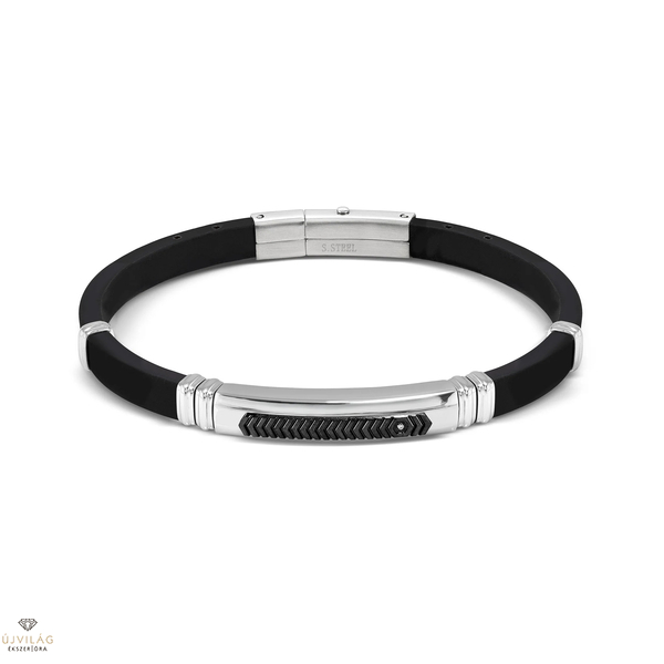 Karkötő gumiból és hipoallergén rozsdamentes acélból, fekete PVD részletekkel és fehér cirkóniával.