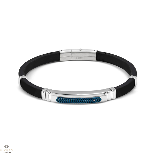 Karkötő gumiból és hipoallergén rozsdamentes acélból, kék PVD részletekkel és fehér cirkóniával.