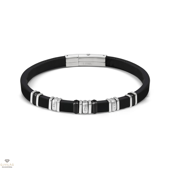 Karkötő gumiból és hipoallergén rozsdamentes acélból, fekete PVD részletekkel és fehér cirkóniával.
