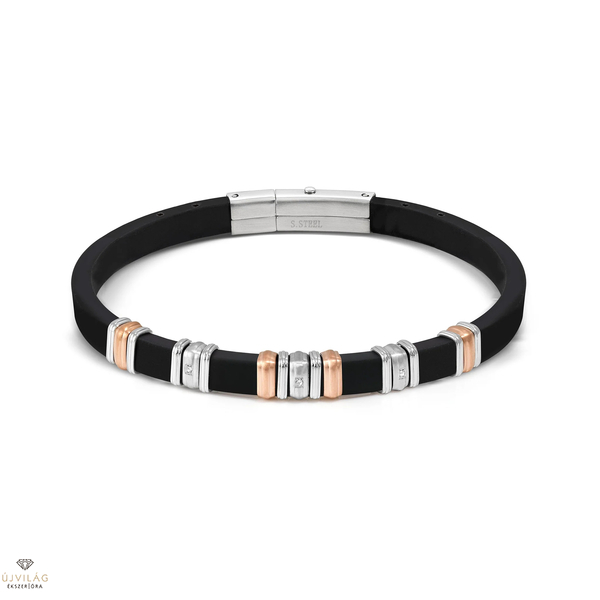 Karkötő gumiból és hipoallergén rozsdamentes acélból, rózsaszín arany PVD részletekkel és fehér cirkóniával.