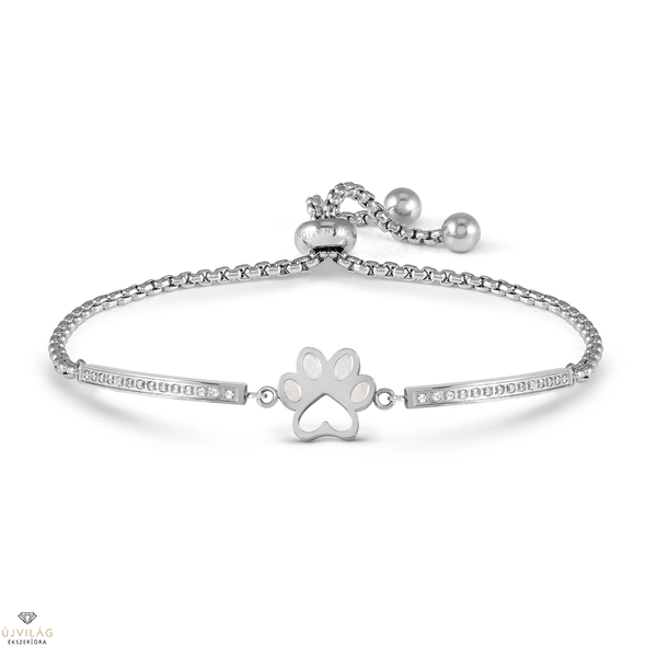 Rozsdamentes acélból készült, állítható karkötő fehér cirkóniákkal és mancsnyom szimbólummal.