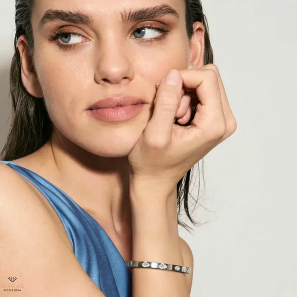 Sima, polírozott ovális karperec rejtett csuklóval és csattal, láthatatlanul ovális, fazettált cirkóniumkövekkel kirakva.