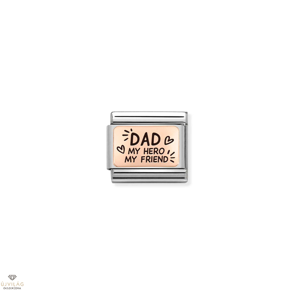 Az ékszerek gyártása során a szakértelem, türelem, kreativitás, az olasz örökség és hagyomány, valamint az összehasonlíthatatlan Made in Italy kézműves kivitelezés a legújabb technológiával és legmodernebb műszaki megoldásokkal párosul. A kiváló alapanyagok, mint az ékszerek alapjául szolgáló legmagasabb minőségű rozsdamentes acél, amely ellenálló az exkluzívrugó mechanizmussal szemben, valamint a 18 karátos arany, 14 karátos rózsaarany, drágakő, féldrágakő és gyémánt kiegészítések megfizethető árral párosulnak, így lehet, hogy a NOMINATION világelső az arany és rozsdamentes acél ékszerek területén. Eredeti összetett láncszem a Nomination Composable Classic karkötőhöz, „Apa, a hősöm, a barátom” felirattal, zománcbevonatú, 9 karátos rózsaarany bevonatú rozsdamentes acélból. Olaszországban gyártva.